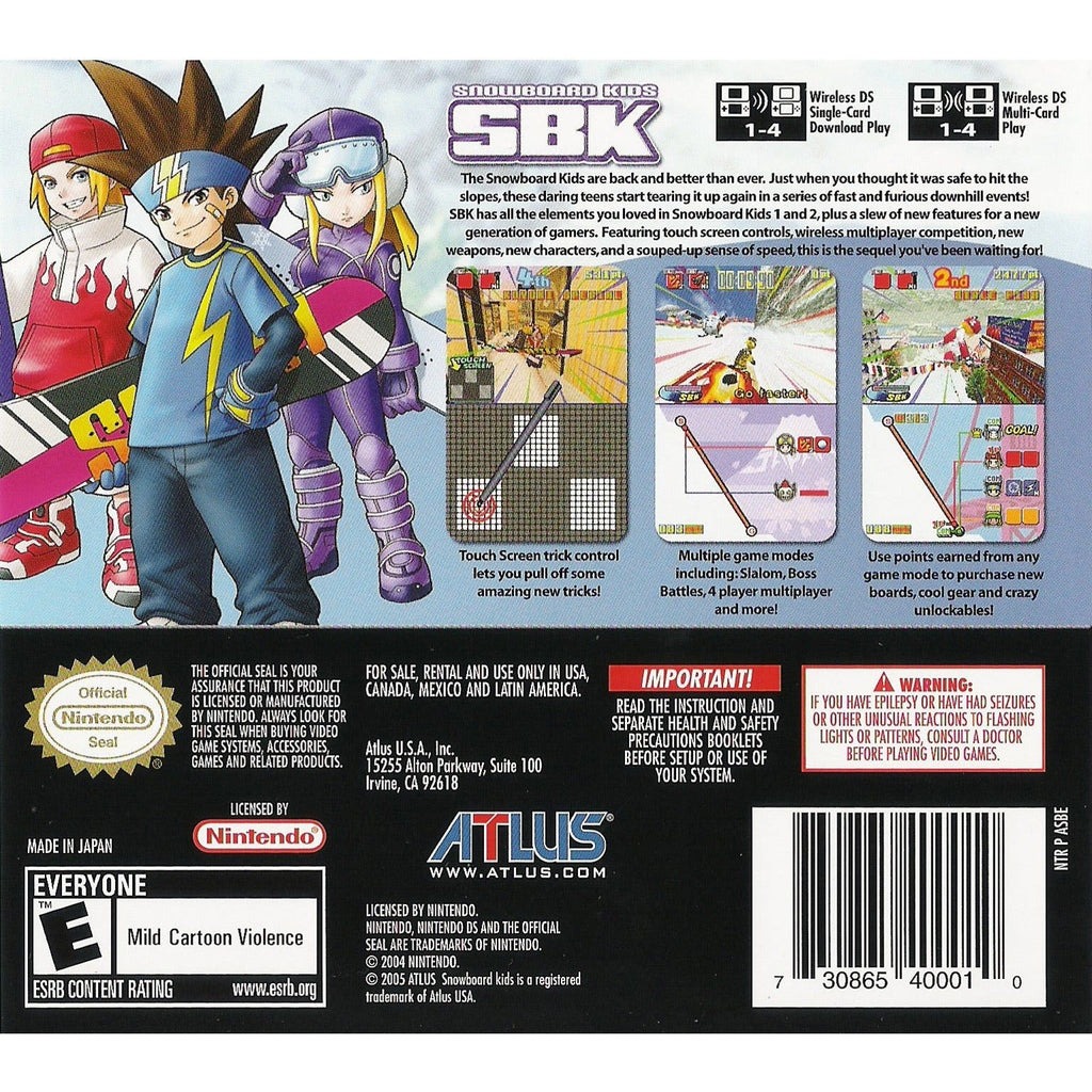 SBK has all the elements you loved in Snowboard Kids 1 and 2, plus a slew of new features for a new generation of gamers. Features touch screen controls, wireless multiplayer competition, new weapons, new characters, and a souped-up sense of speed. Score mad points by obtaining items, doing tricks, and earning a high ranking for each lap! Take advantage of key areas perfect for doing the hottest tricks. By pulling off sick tricks, fill your SBK Meter and unlock special tricks unique to each character. Use money earned from any game mode to purchase new boards and other cool gear.