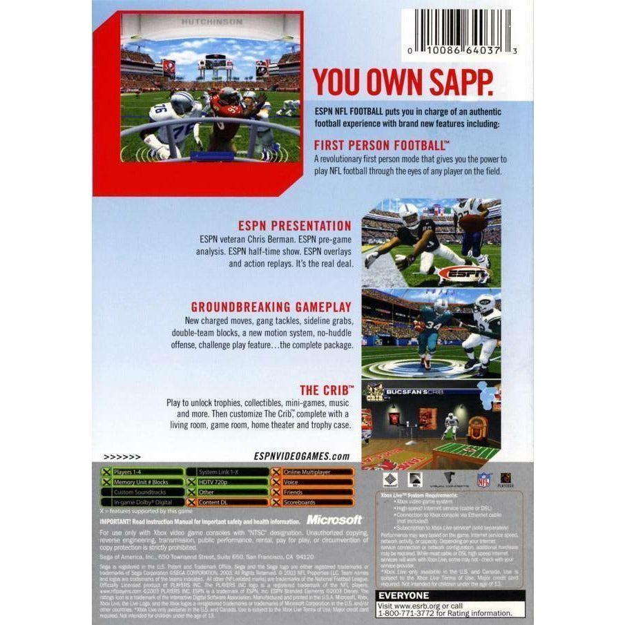 Sega's latest addition to its NFL 2K series, ESPN NFL Football delivers the most complete NFL experience. Experience a new level of gaming through First Person Football, a mode that allows you to see the game through the eyes of any player on your team. Earn and unlock trophies, mini-games, and music to show off in your Crib. Listen to commentary from ESPN's own Chris Berman and watch the game as if you're watching an ESPN broadcast. Take on your friends or play online.